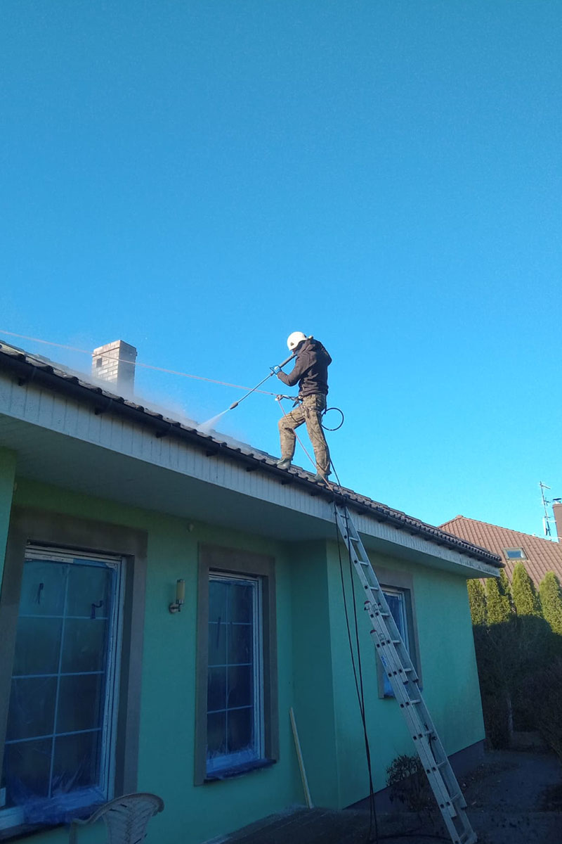 Realizujemy mycie i konserwację dachów, elewacji oraz bruku na budynkach jednorodzinnych, wspólnotach mieszkaniowych i obiektach przemysłowych. Pracujemy w pełni bezpiecznie — używamy certyfikowanych środków biodegradowalnych i sprzętu do pracy na wysokościach.